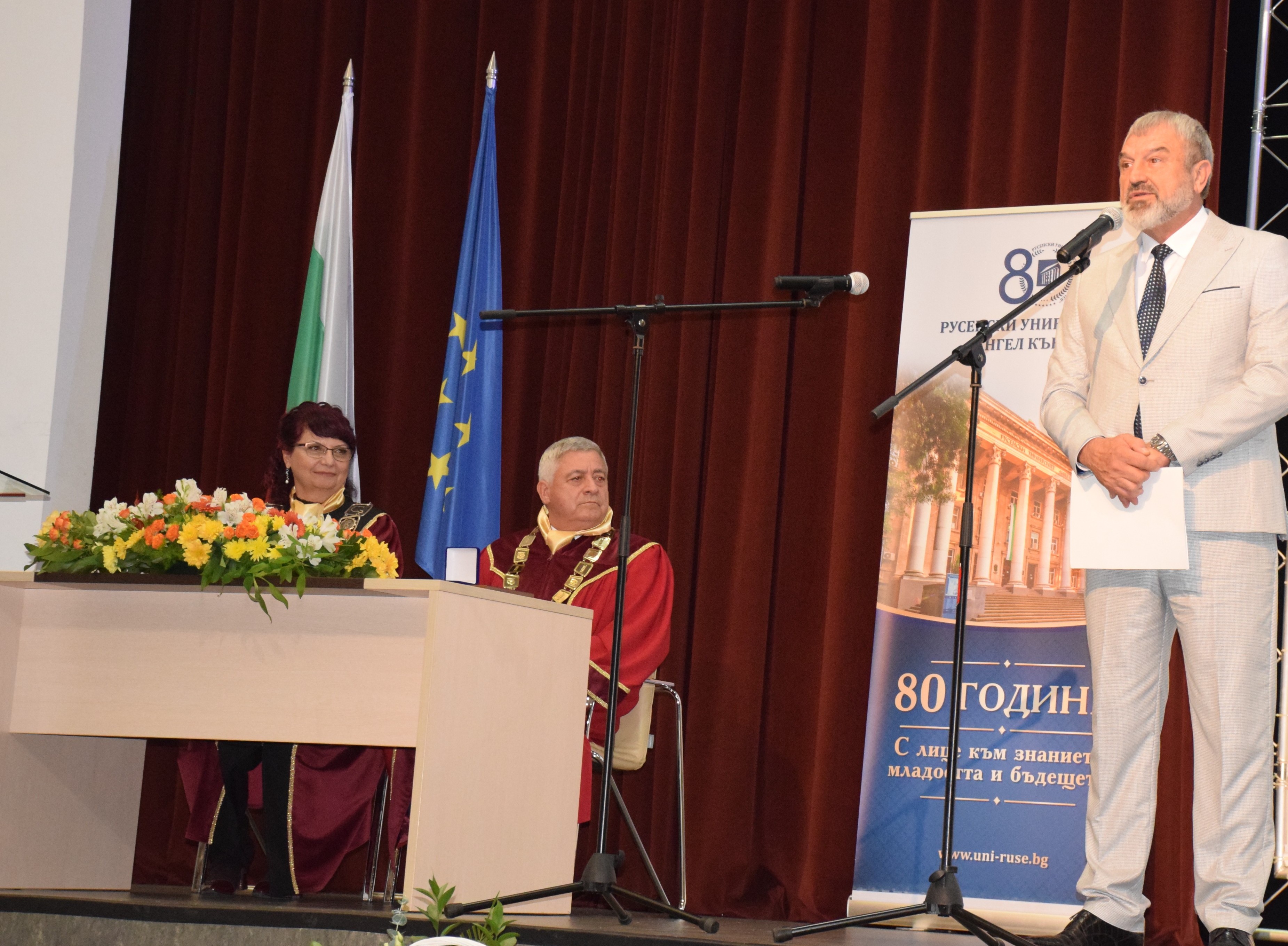 On behalf of the management and academic community of the higher education institution, the ceremony was also attended by: the Chairman of the General Assembly and Honourary Rector of the University of Ruse, Academician Hristo Beloev, DscEng, the Vice-Rector for Academic Affairs, Professor Teodor Iliev, PhD , the Vice-Rector for International Cooperation, Associate Professor Galina Ivanova, PhD and the Vice-Rector for Research Professor, Daniel Bratanov, PhD, deans of faculties, members of the Academic Council and students.