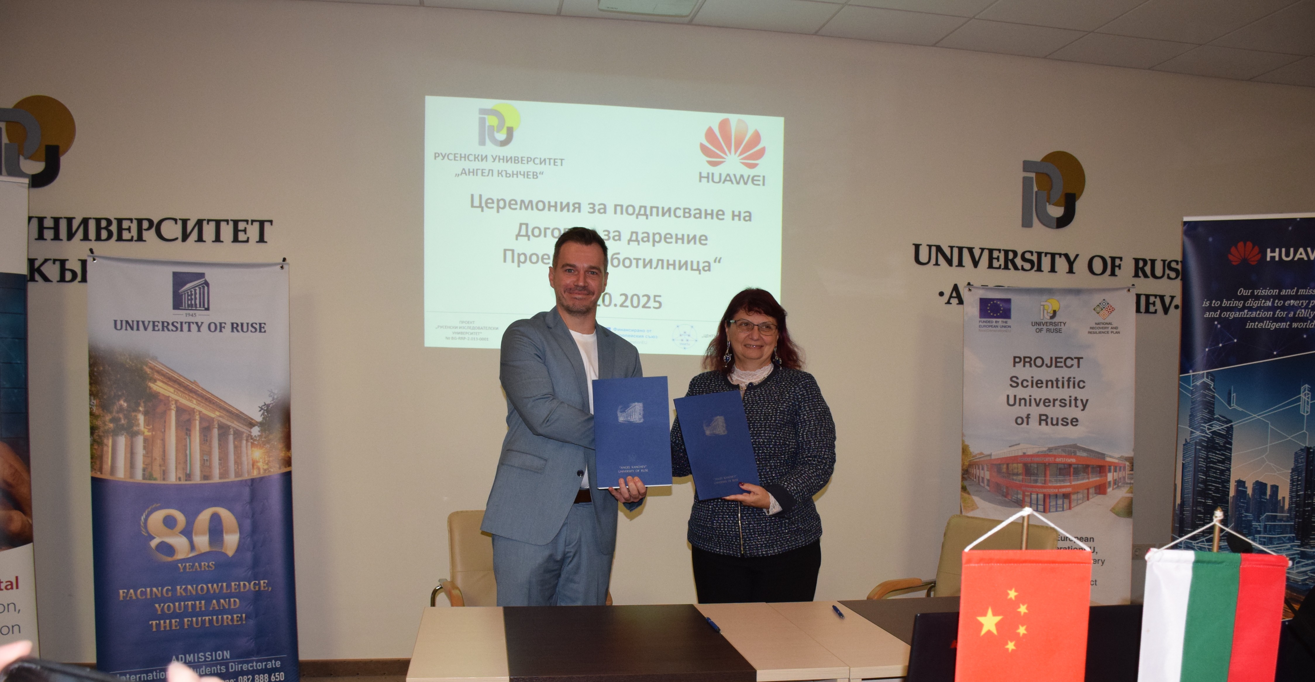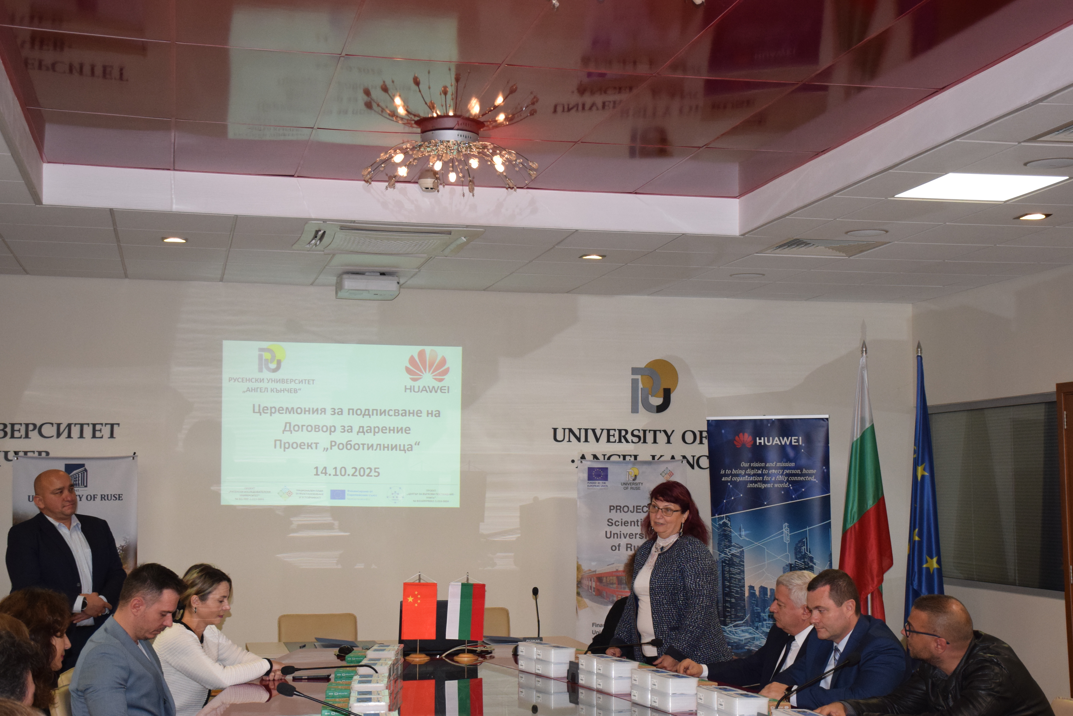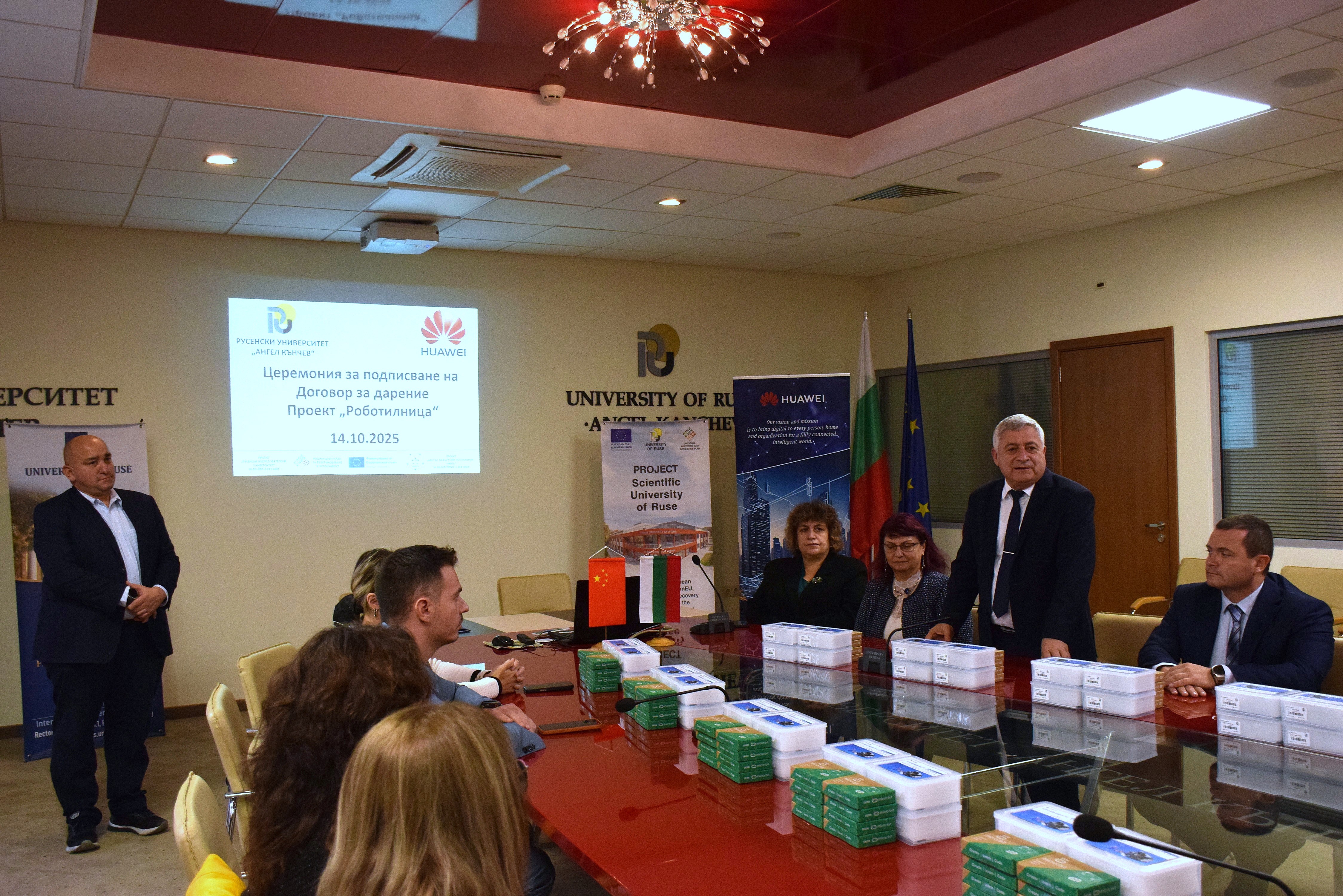 On November 12th , 2025, a meeting was held between the management of the University of Ruse and Huawei Technologies Bulgaria EOOD. The meeting was attended by the rector of Assoc. Prof. Desislava Atanasova, PhD and academician Hristo Beloev, DscEng - honourary rector and chairman of the General Assembly of the University of Ruse. and the technology giant was represented by Mr. Li Zemin, General Manager of the company for Bulgaria, Mr. Chris Hu, Director of the Corporate Clients Division, Mr. Ruslan Tsankov, Key Account Manager and Ms. Raya Guncheva, Public Relations Manager.
